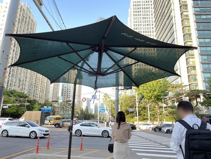 ソウルに住んでいて、夏を感じるのがこの大きなグリーンのパラソルです。韓国語ではクヌルマッ(그늘막)といい、直訳すると日除け幕です。日除けができない横断歩道の前に設置してあるところがほとんどです。ソウルは大通りが多く、信号の待ち時間が長いので、夏の日射しが厳しい日にこの日除け幕があると、とても助かります。
