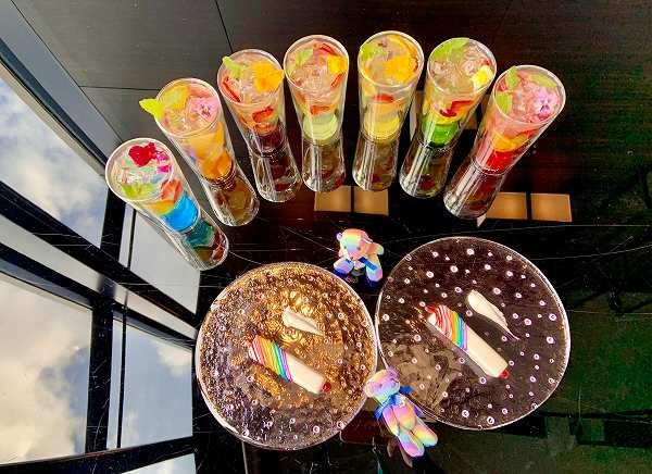 40階オールディダイニング「アトモス・ダイニング」では6月9日(木)限定で、レインボーカラーのウエルカムモクテルと5周年記念のアニバーサリーケーキが予約の利用者に無料提供。