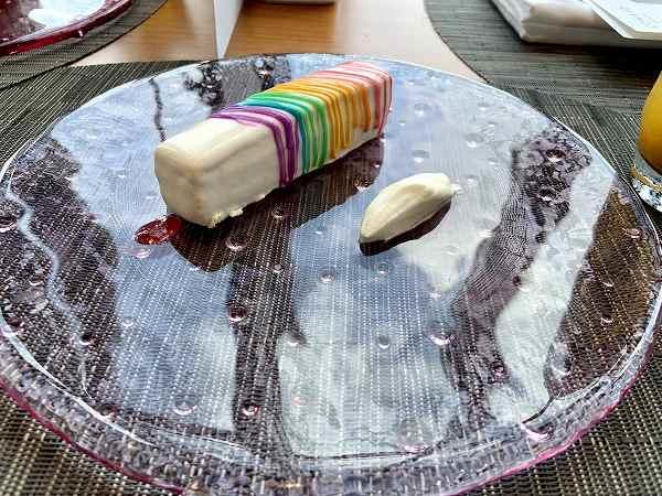ホワイトにレインボーカラーがおしゃれ。タヒチ産バニラビーンズがあしらわれたシャンティ―がベースとなり、ラズベリーとマンゴームースが爽やかな酸味とフレッシュ感いっぱい!