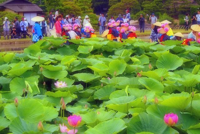 水田の隣には蓮池があります。後楽園では来月、7月3日に観蓮節もあります。この日だけ朝4時から入園できて、夜明けとともに開花する蓮の花を愛でます。以前はお茶会もありましたが、残念なことに今年はないようです。一度参加したことがありますが、早朝のお茶会も、いいものでした。