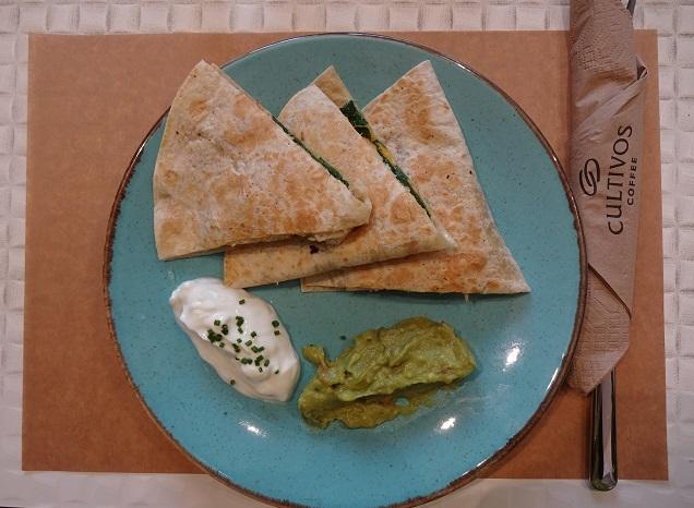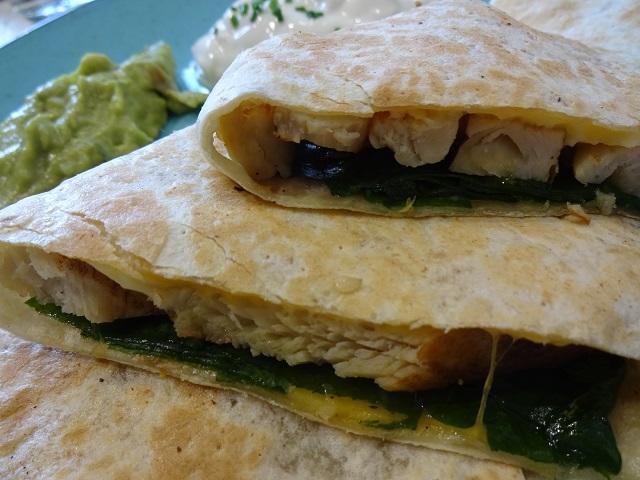 私はチキン・ケサディーヤを。焼き立てトルティーヤに薄切りチキン、ホウレン草、チーズ(この店ではエダム使用)を挟んだホットサンドです。