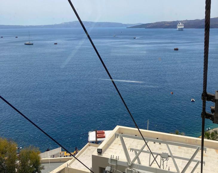 沖から小型の船に乗り換えてサントリーニ島の港、オールドポートへ。ここからはケーブルカーで島の中心部フィラへ向かいます。サントリーニ島はフィラのバスターミナルから島内をバスで移動できるのでオプショナルツアーには参加せず、個人で観光することにしました。初めて訪れる方、史跡の詳しい説明が聞きたい方はガイド付きオプショナルツアーに参加するのもいいでしょう。港にはケーブルカーへの案内表示があり、すぐそばの階段を上がったところが乗り場です。