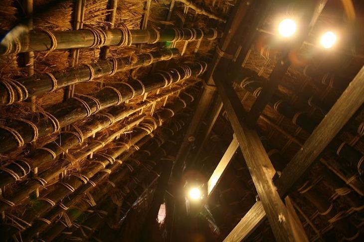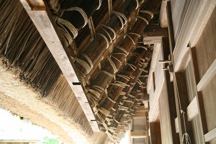 かやぶき屋根を支える木と縄。