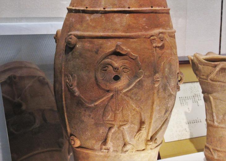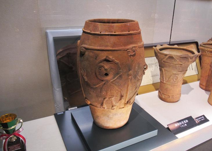 なんてユニーク! 3本指で、ピースしているみたい。ワインの樽のようにも見えますね。約5000年前にこんなに個性豊かな土器が作られていたなんて驚きです。有孔鍔付土器とは、土器の口が平らで、その下に刀の鍔(つば)のような帯が付けられ、その上にいくつもの小さな孔(あな)が一定間隔で空けられているものをいうそうです。