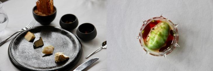 左:鴨肉 コールラビ シルバースキンオニオン ルバーブ、チキンソース