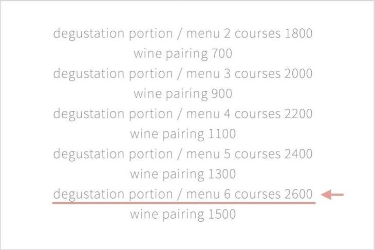 ■メニューについて メニューはノンベジタリアンとベジタリアンに分かれていて、それぞれ5種類のコースから選べます。今回、私たちがオーダーしたのは、1人2600コルナ(約1万3000円 / ノンベジタリアン)のコースです。コースの料金は、ノンベジタリアンとベジタリアンに関わらず均一なようです。