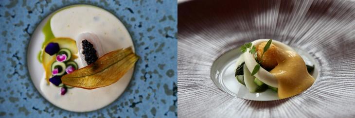左:チョウザメのソテー ズッキーニ バジル キャビア レモンのブールルランソース