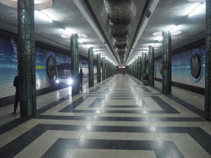 次の目的地の最寄り駅、ボドムゾル駅へはタシケント地下鉄(タシケントメトロ)を利用します。ここも立派な観光名所のひとつ、というよりむしろ個人的にはこれがタシケントで一番の見所だと思っています。あえてハードルを上げておきますが、初めて乗られる方はホームの個性豊かで美しい内装に息を呑むはず。特にウズベキスタン工芸博物館最寄りのコスモナウトラル駅は、旅行者の方に人気の駅のひとつです。
