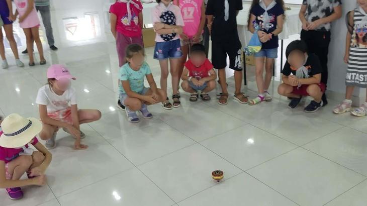テーブルの上にはこま、けん玉、羽子板、紙風船といったおなじみのおもちゃが並び、人生で初めて見たであろうこれらのおもちゃに子供たちは興味津々。