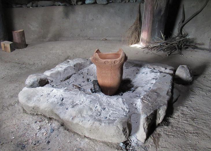 再現した炉と深鉢のレプリカです。料理するお鍋にしては深すぎないかと思っていたんですが、こうして直火にかけるといちばん熱の伝導効率よく調理できる形がこれなのだとか。縄文時代の人々は、日々の暮らしのなかで使いやすい調理器具を作ろうと模索していたんですね。