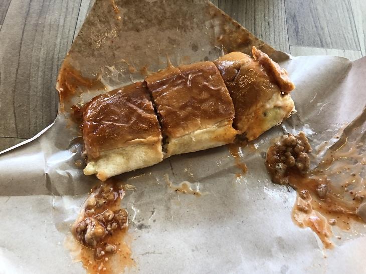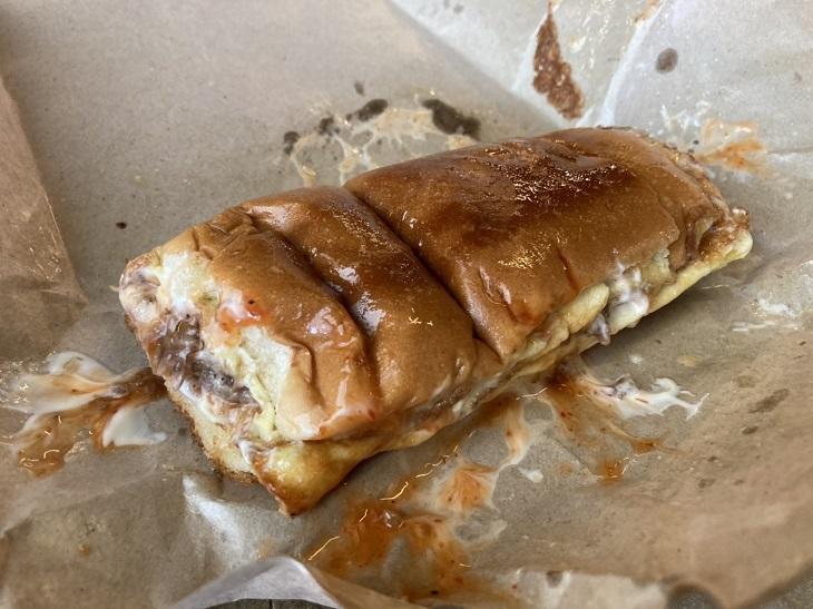 見た目にさほど差はないですが、具がしっかりと収まっています。肉の味を感じて、ソースがそこまで辛くないと感じました。パンもふわふわ、直径15㎝ぐらいありますが、ぺろり。