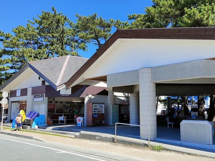 売店には、焼きそばやフライドポテト、唐揚げのほか、かき氷や冷たいドリンクなどもあります。またボディーボードのレンタルも。(海の家は他にもあります)