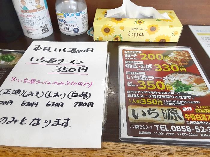 ラーメン店ですけぇ回転も早く苦にならない、逆にわくわく度増す感じでしばし待ちましたが、カウンター席に案内されたので着席をしてオーダー。待っている間、メニュー表を見ると毎月1日のいち源ラーメン以外にも曜日によって餃子だとか焼きそばだとか「〇〇の日」とありましたよ。