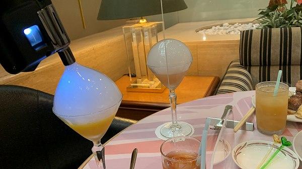 ホテルのバーテンダーさんが考えたスペシャルドリンク、マンゴーとピーチのノンアルコールカクテルに、スモークが入ったバブルをトッピング。バブルがはじけると、パッションフルーツの華やかな香りが流れ出てきます。
