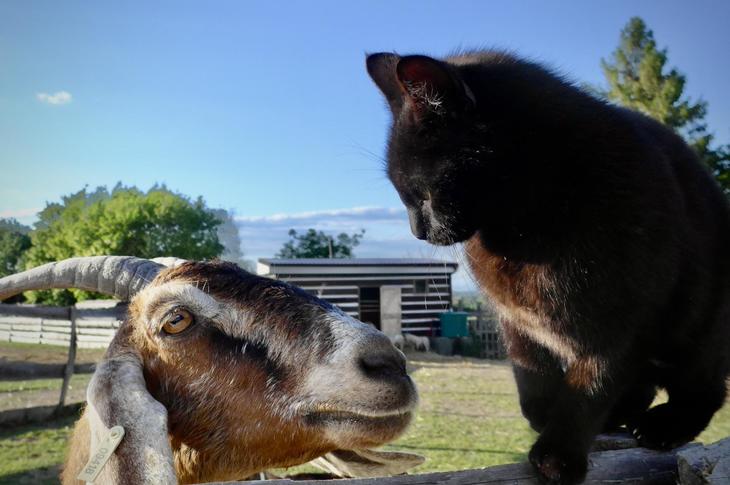 もちろん、作業の間には動物と触れ合うこともできます。牧場では、数種類の動物が同じ空間にいても喧嘩をすることなく、リラックスして暮らしています。鹿に体を擦り付けて甘えている猫や、追いかけっこをするウリ坊の猪たちなど、動物同士がとても仲良しで平和な様子に驚きました。また、動物たちは私たち人に対してもフレンドリーで、撫でて欲しそうに寄ってきます。