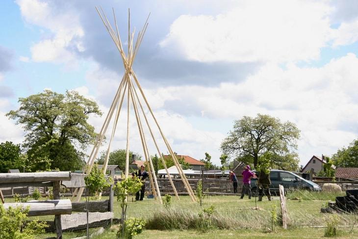 夕食は建てたばかりのティピの中で、焚き火を囲みながらヴィーガン食をいただきました。ちなみに、Farma Nadějeで提供される食事は、すべて動物性食品を使用しないヴィーガン食です。
