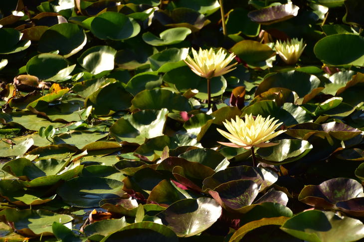 緑いっぱいの蓮の葉。その中にちょこちょこと白やピンクの蓮の花が咲いています。
