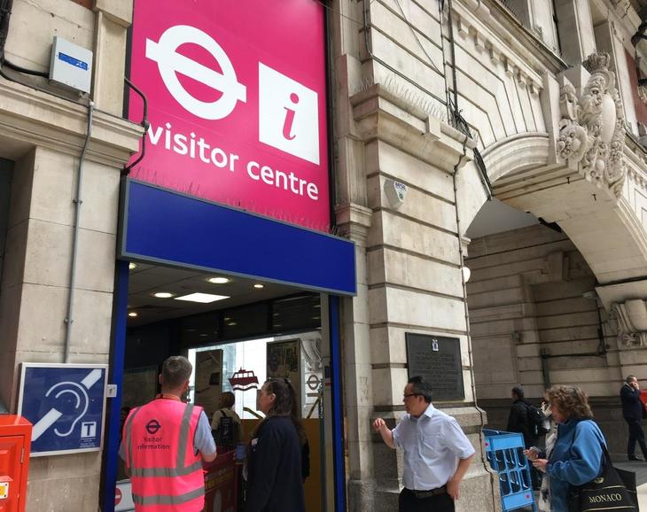 地下鉄入り口近くにある観光案内所 (Visitor Centre) では無料の市内地図やバスマップをもらえ、建物の外ではスーツと革靴、頭には案内板と同じデザインの帽子をのせ、全身を黒に身を包んだ案内人が親切に声をかけてくれます。