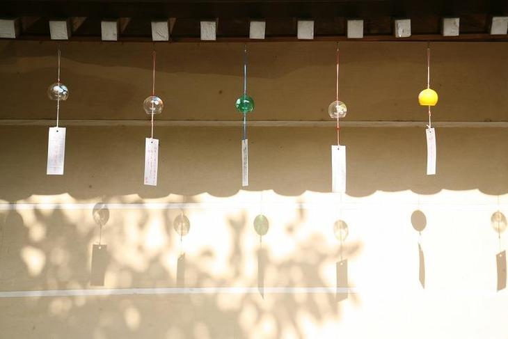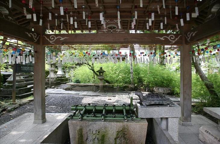 夏限定の「風鈴祈願」は、楼門をくぐって右手にある手水舎のとろこや授与所の天井や境内のあちこちにも風鈴が飾られています。