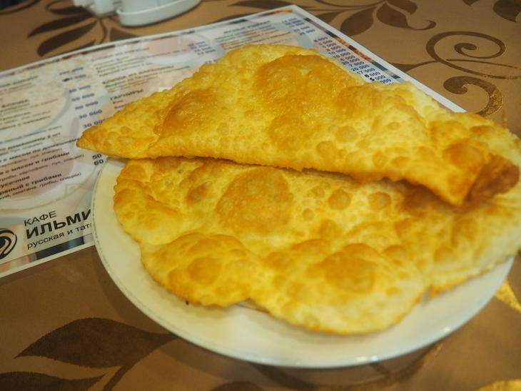 そしてこのチェブレキこそがタタール名物料理。肉などの食材を大きな薄い皮で包んで揚げた、サクサク食感が印象的な食べ物です。このお店では肉、チーズ、トマトチーズ、ジャガイモの4種類がありました。包み揚げというとこの国ではウズベクサモサをイメージしてしまいますが、それより大きいのに脂少な目で食べやすい!
