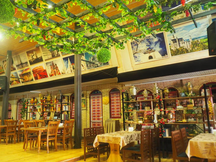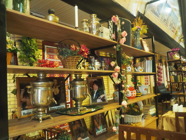 店内もこの通りで、まるでウズベク人民家でよく見るブドウの木の下にいるよう。ロシア伝統の湯沸し器、サモワールなども飾られています。