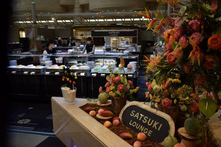 この広いロビィの真ん中にあるのがSATSUKI LOUNGE(サツキラウンジ)で、スイーツビュッフェが楽しめます。特に春のイチゴビュッフェは大人気で、すぐ予約がいっぱいになってしまいます。