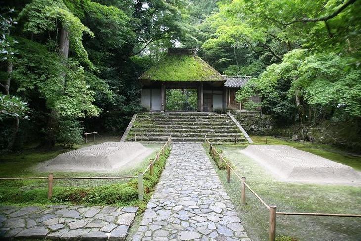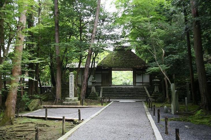 深い緑の中に茅葺き屋根の山門もしっとりとしています。