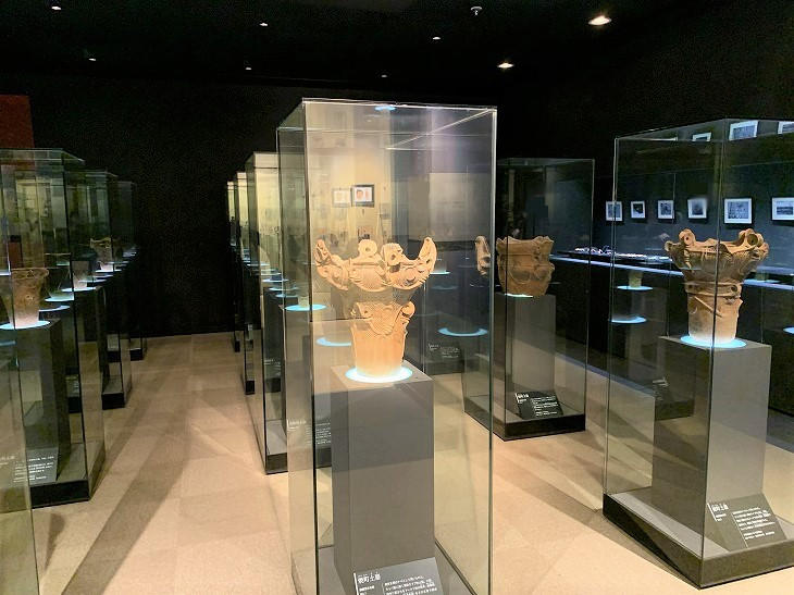 5000年前の「焼町土器」。国の重要文化財です。写真では伝わりませんが美しく並んでいます。