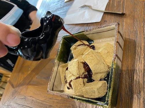 お菓子は事前に注文が必要ですが、わらび餅はその場で注文できます。注文を受けてから作るので15分ぐらいかかりますが、トロッと優しいお味で、とっても美味しかったです!猫の口から黒蜜~