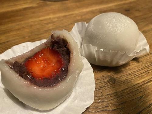 ガブッとかぶりついた画ですみません。こちらもお餅が柔らかくて、あんこの甘さといちごの酸っぱさが美味しいですよね。子供たちとパクパク食べてしまい写真を忘れましたがクリームいちご大福もかなり美味しかったです、クリームとちょっとあんこの和洋折衷。ということで、大満足・満腹の1日でした。