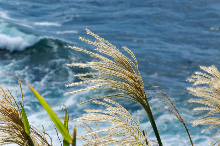 積丹町の海風が直接吹き付ける辺りは、少し季節が進んでいるようで、ススキの穂が開き始めています。