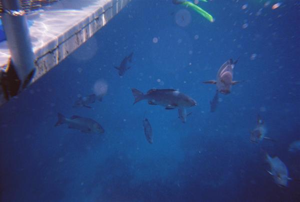 魚の食事タイム、餌を投げると魚たちが寄ってきます。