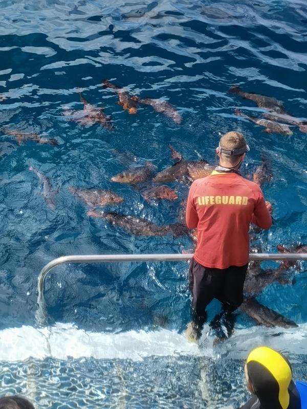 このツァーでは、ポンツーンと呼ばれる海上デッキがあるのが他と違うところです。スノーケル・ダイビングツァーはたくさんありますが、ほとんどのツァーが船上で時間を過ごすことになります。