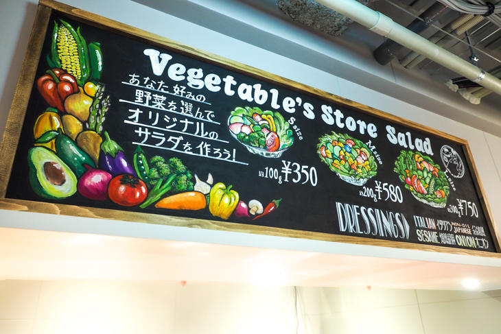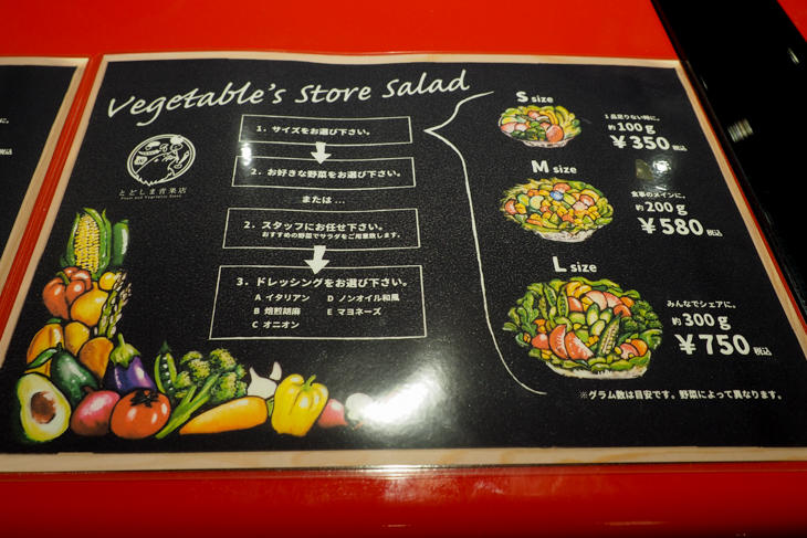野菜やフルーツの販売のほか、お好みの野菜でSサイズ(約100g350円)、Mサイズ(約200g580円)、Lサイズ(約300g750円)のオリジナルサラダを作ってもらえるほか、生フルーツゼリーも販売しています。