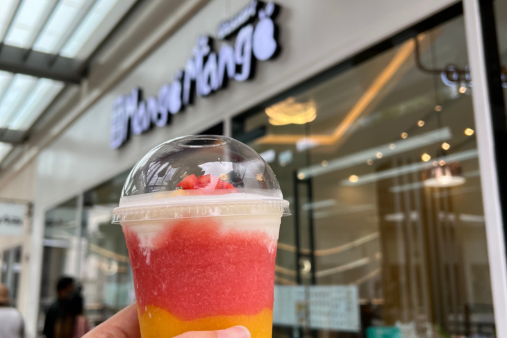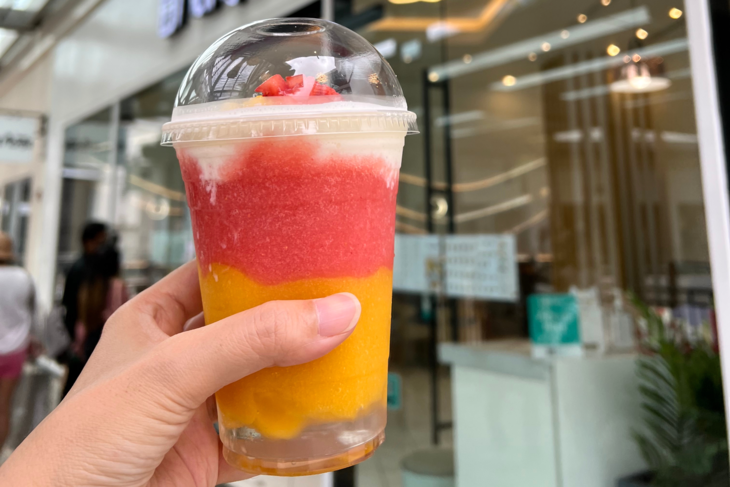 一番下にはクリスタル・ゼリーがたっぷり、そしてマンゴースムージとストロベリースムージを注いで、一番上にはココナッツスムージ。トッピングは新鮮マンゴーとイチゴです。飲んでみると、思ったほど甘くなく、さっぱりしています。夏の暑い日の水分と糖分の補給にぴったりです。