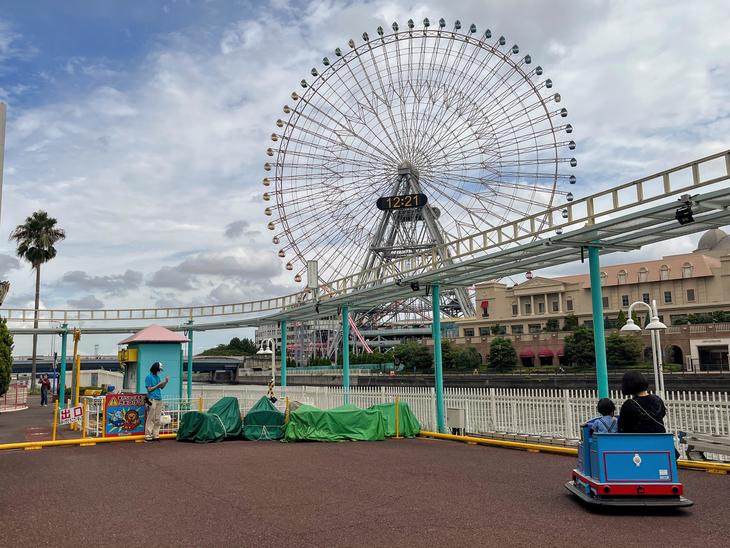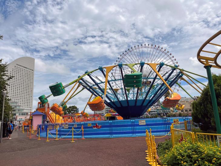 みなとみらいの高層ビル群のなかにある遊園地、大きな観覧車が有名なよこはまコスモワールド。
