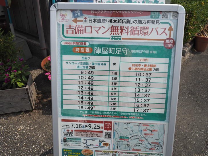 この陣屋町足守へは、交通公共機関で行く場合は、吉備ロマン無料循環バスで行くと便利です。9月25日までの土日祝のみの運行になりますが、予約も不要で乗り降りも自由です。