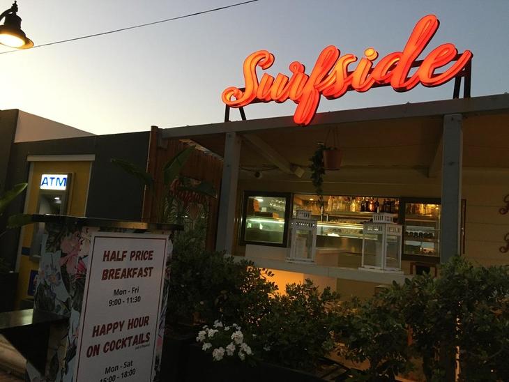 と、そこで何時なのか鐘が鳴り出し、夕陽に照らされた海と音色が相まって、幻想的な光景が目の前に現れました。そのままさらに歩みを進めると、いくつか海沿いのレストランがあったので、そのうちのひとつ「サーフサイド(Surfside)」に入りました。