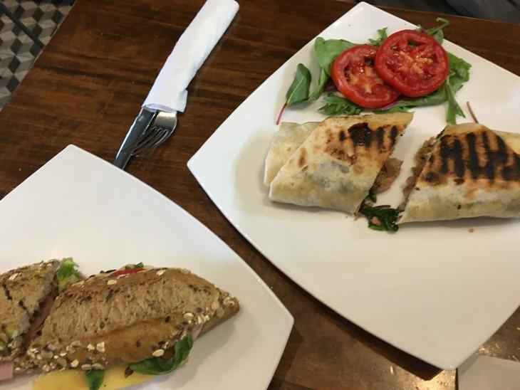 なかでもラップサンドは人気なようで、どの店でもたいていは残りわずかなことが多く、このとき入った「ノラ・カフェ(Nola Cafe)」にも3つしかありませんでした。最後に残っていたサーモン(€4.5)とツナ(€4)のラップ、ハム・チーズのバケット(€3.5)を頼みましたが……