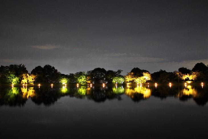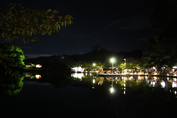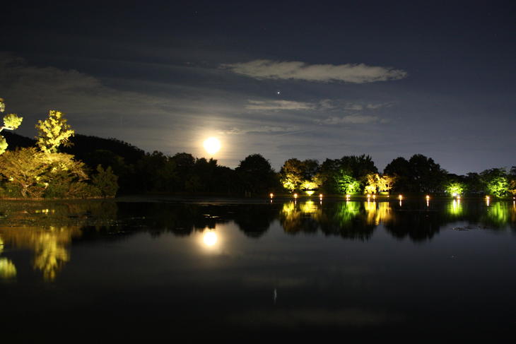 12日の夜、池には風もなく水鏡の世界が広がっていました。
