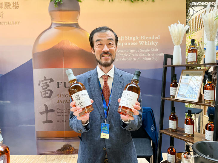 そこでまず再会したのがキリンのマスターブレンダーである田中城太さん。前にパリのほかのイベントでお会いしたのが2018年だったため、じつに4年ぶりです。同社が富士御殿場蒸溜所で造るウイスキー「富士」のプロモーションでした。富士御殿場蒸溜所は、モルトおよびグレーンウイスキー原酒の両方を製造している蒸留所です。