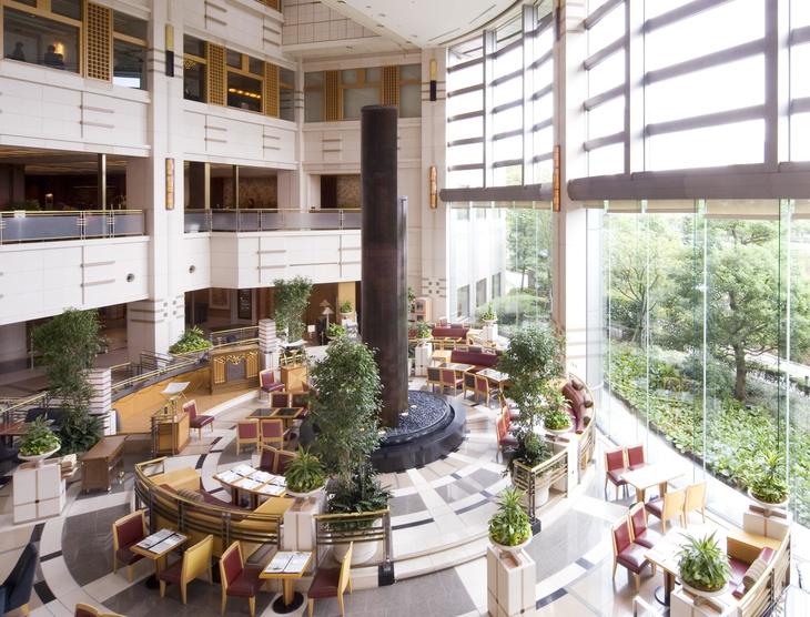 帝国ホテル 大阪のテーマ「水、緑、花そして光と影」が表現された24mの吹き抜けのアトリウム、水のオブジェに窓からの差し込む優しい陽光が心地よい、解放感溢れるロビーラウンジです。