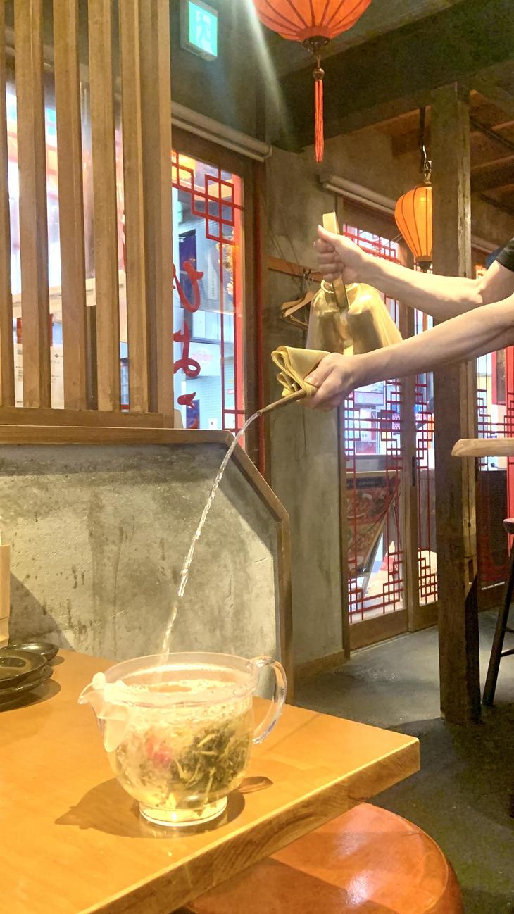 新しく登場した飲茶セットを頼むと茶芸のパフォーマンス付きです。