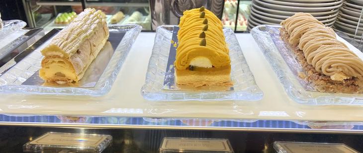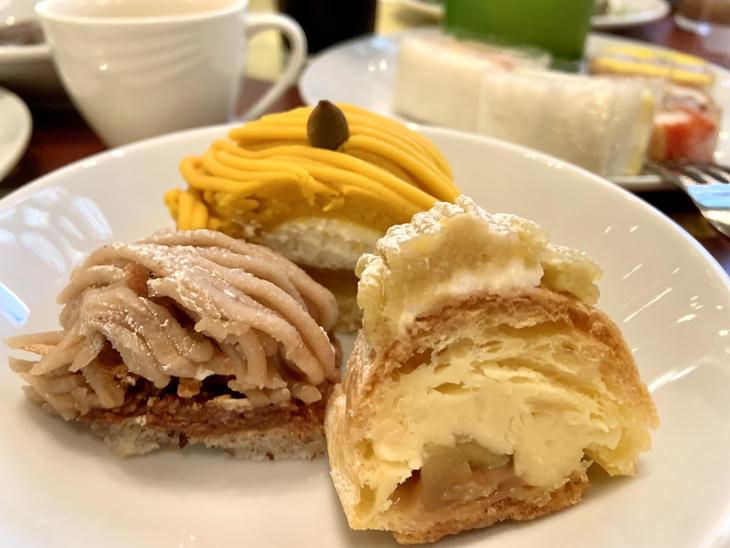 モンブランの3種食べ比べ、どれもおすすめです。特に、複雑な層に分かれてあり、いろんな味が楽しめる"かぼちゃ"がお気に入りです。