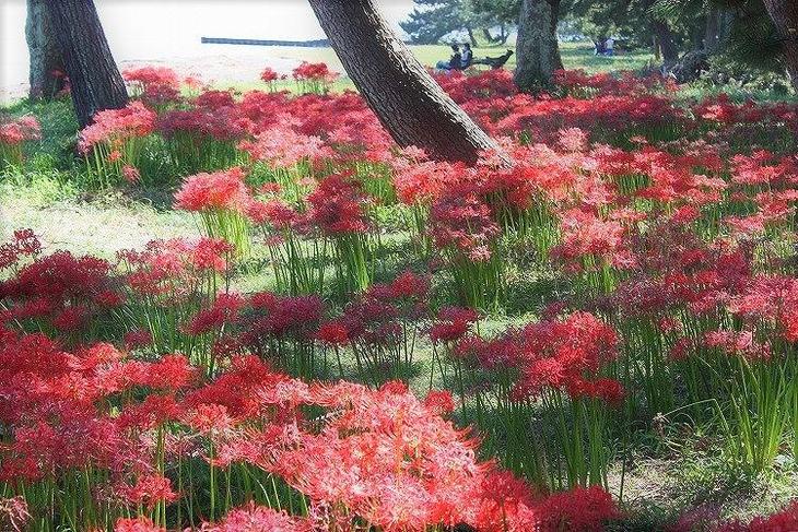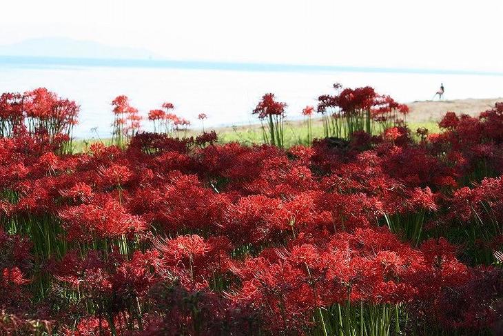 琵琶湖の西側の高島市新旭町の源氏浜では、真っ赤な彼岸花が