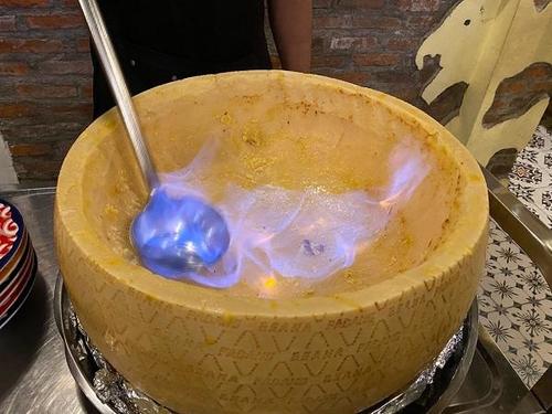 パルメジャーノの塊を炎で溶かしてここにパスタをインしてまぜまぜ。