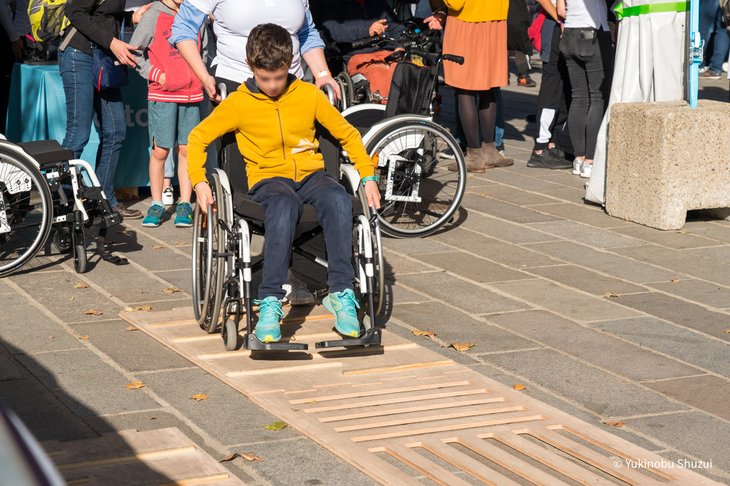 たとえば、車いすを体験できるコーナー。車いす移動の大変さは、健常者にとってある程度のイメージはできますが、実際にどれくらい大変なのかは乗ってみないと分かりません。人工的に作られた段差のある道を実際に車いすに乗って体験します。