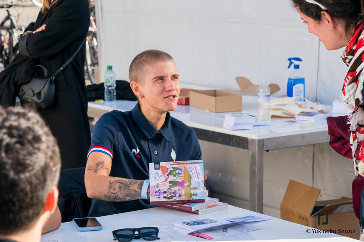 選手たちとの交流会も開かれました。2020年パラリンピック東京大会で女子C5パシュート個人で銅メダルを獲得したフランスのマリ・パトゥイユ選手のサイン会では、多くの人が列を作ってパトゥイユ選手と話したり交流を深めていました。