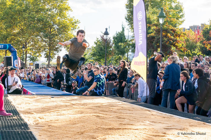 会場に設置された長い陸上レーンでは、義足での走り幅跳びのデモンストレーションを開催。両脇に市民が見学する中、片足義足と両義足の選手が見事なジャンプを披露しました。