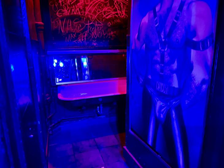 聞けばなるほどと思うトイレを一つご紹介します。お客さんの90%以上が立って用を足すゲイバーのトイレ。カストロ地区は、ゲイコミュニティー世界的にも有名ですが、反面最近はやや観光地化されつつあり、観光客の女性のお客さんの姿を見かけるバーも増えてきています。そんな中でも女性のお客さん率1%、老舗のゲイバーのトイレがこちら。昼夜を問わずこの明るさで白く浮き出ているのがおトイレです。水道の蛇口がない細長い手洗い場のような形です。手洗い場のような便器の正面に鏡があるのは何故でしょう?ここにはドアもなく、立って用を足している後ろ姿は丸見え。そして、座って用を足すトイレは、簡素なドアで知ってる人しか分からず、トイレの場所を聞かないと見つけられませんでした。男性用・女性用の区別はなく、よく言えば"オールジェンダー"ゴツい体つきのワンピース姿の男性が立って用を足してても誰も振り返らない摩訶不思議な空間のトイレです。